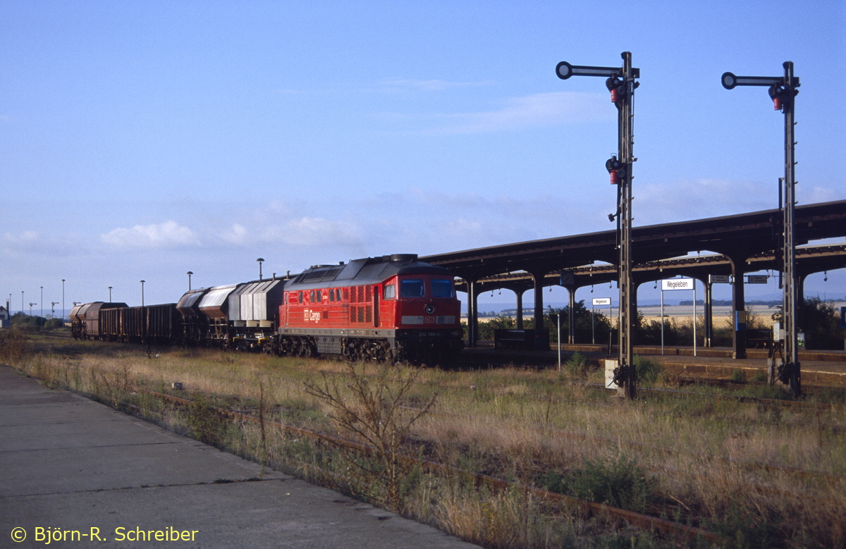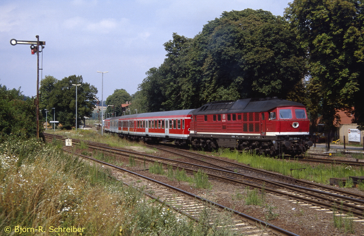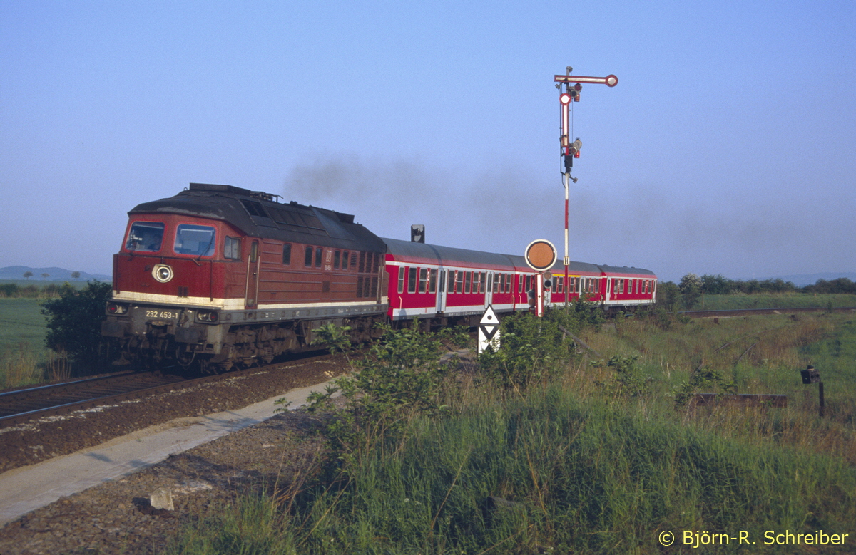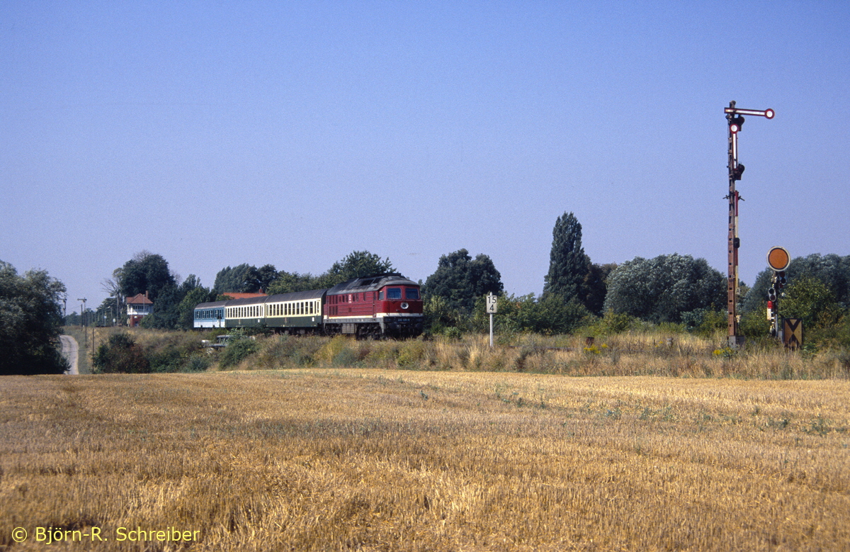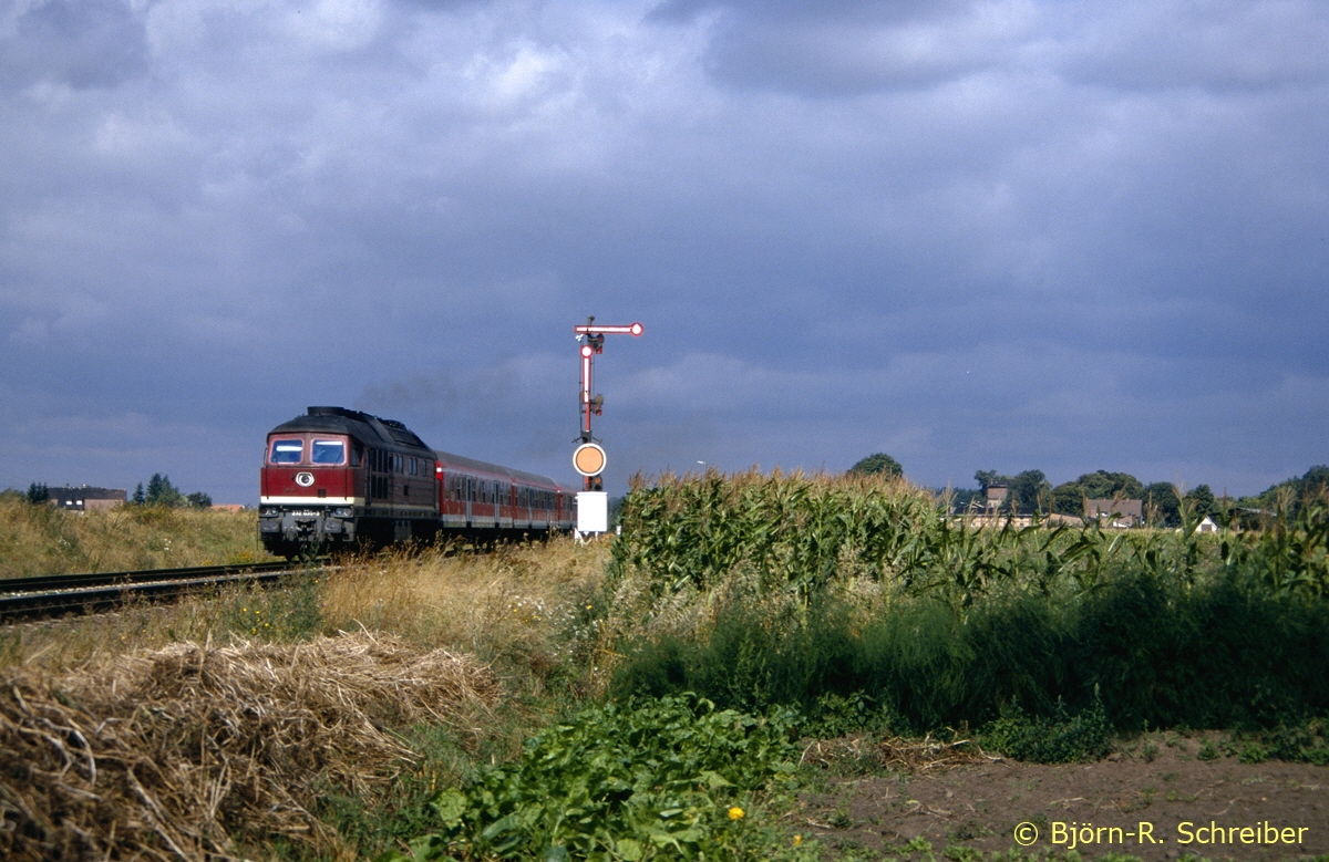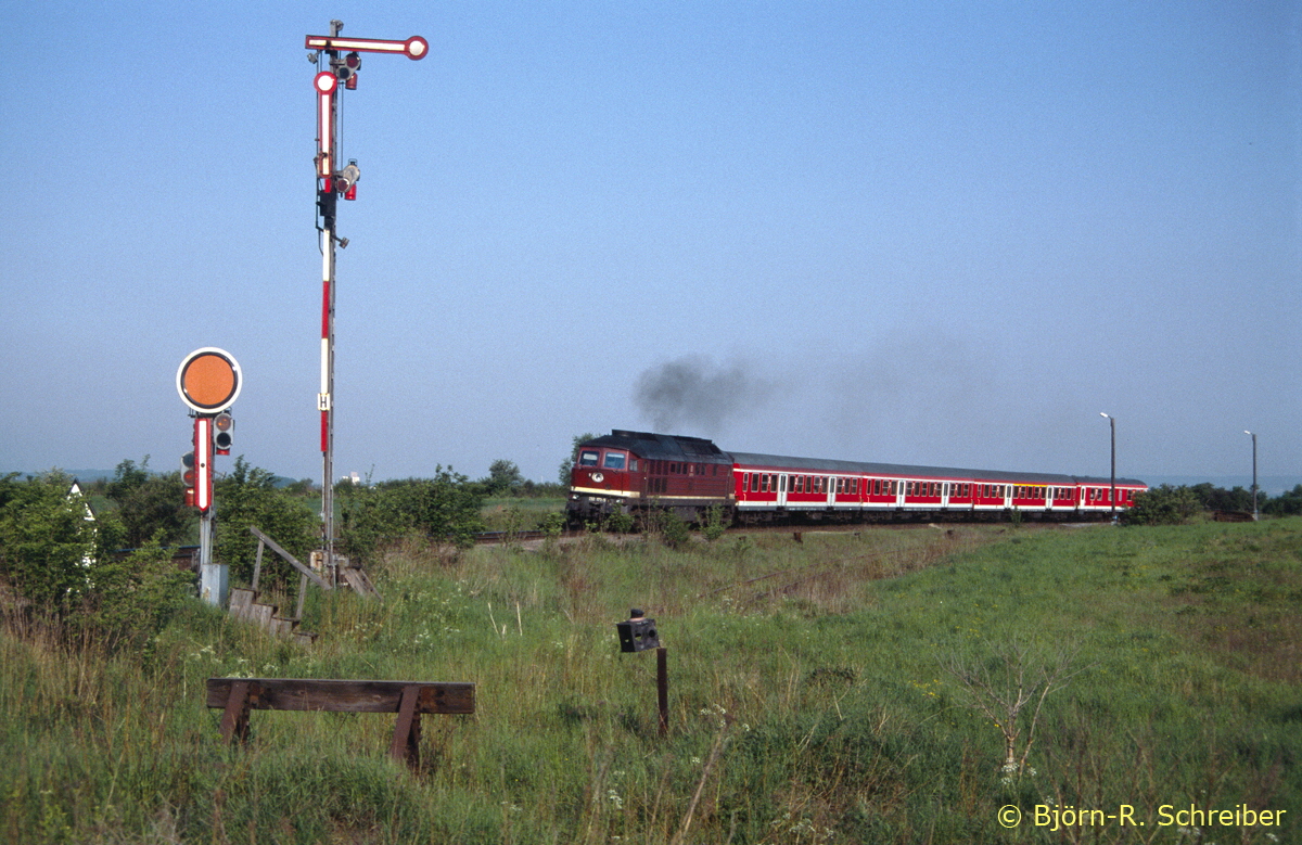 Beginnen wir am Einfahrsignal von Langenweddingen am 21.08.1997 mit 232 128 und RE 3529 |