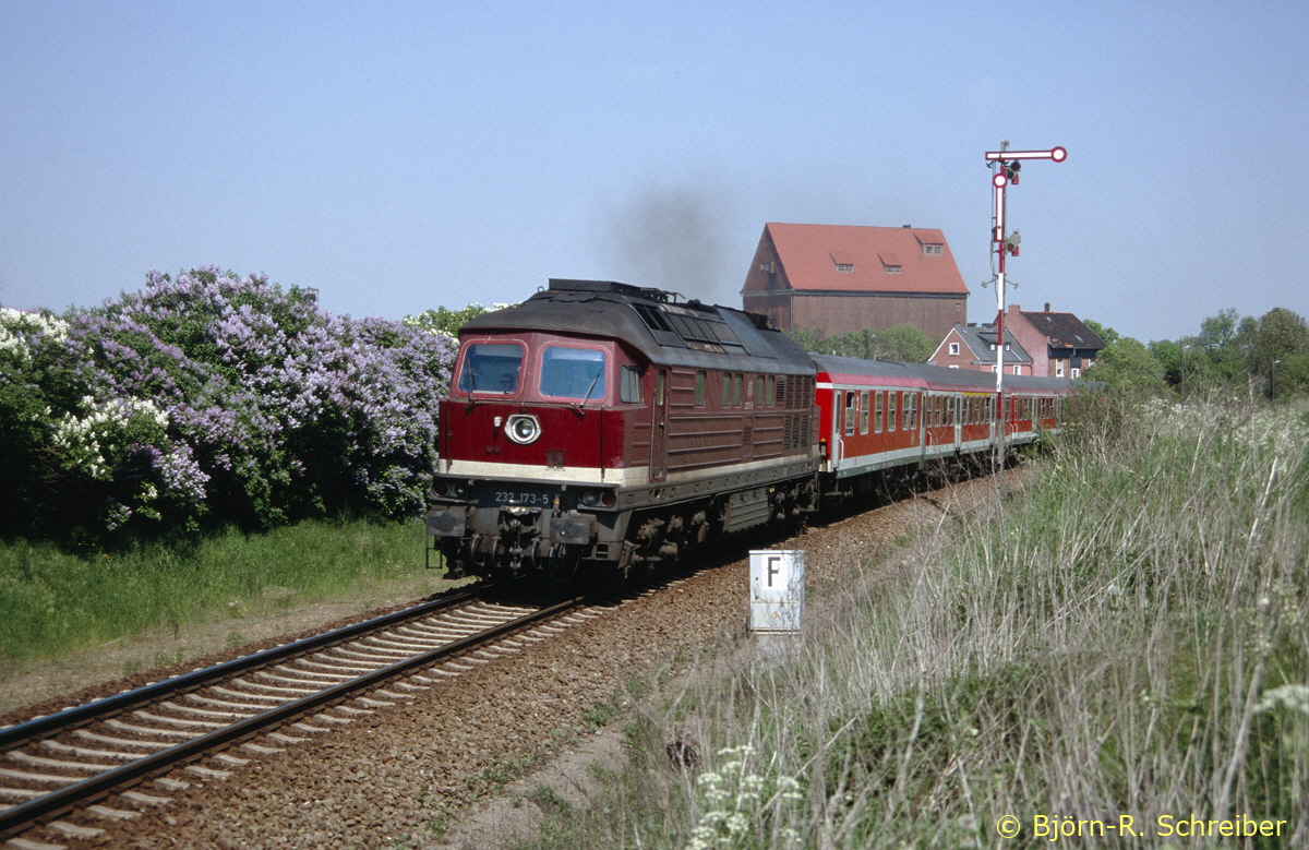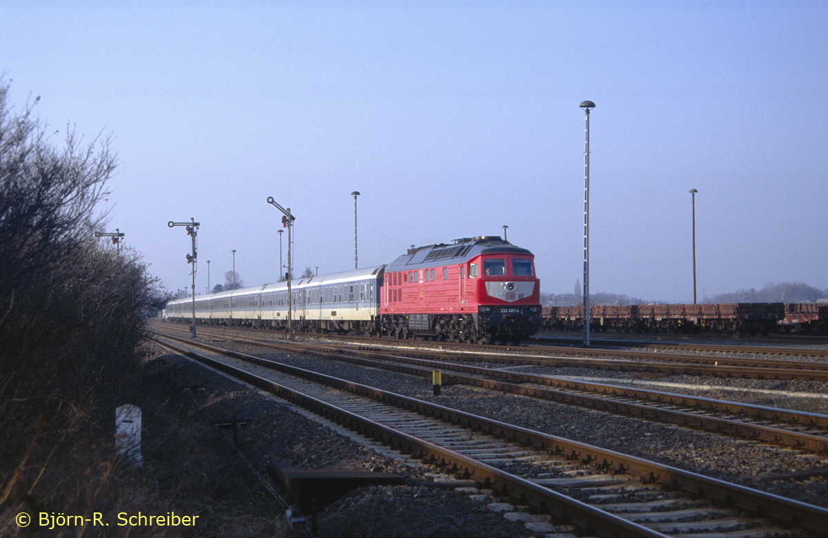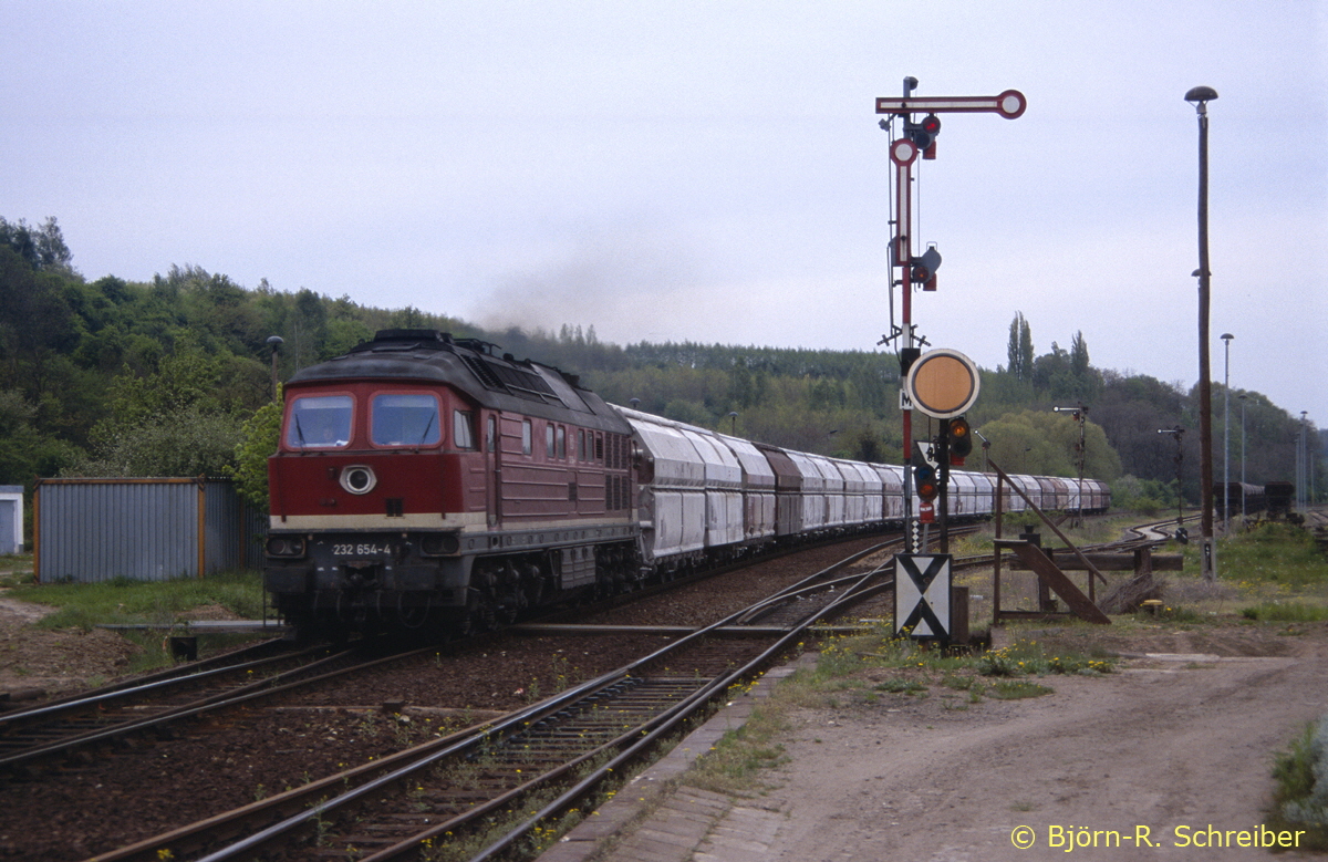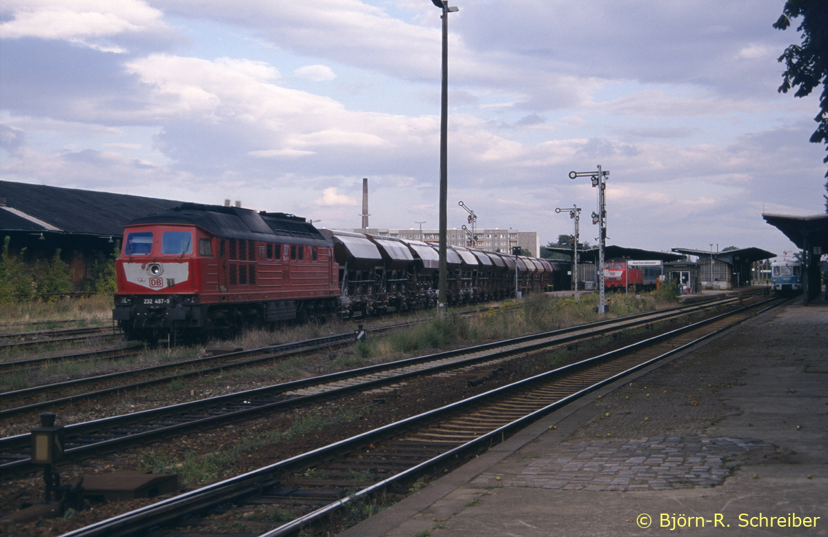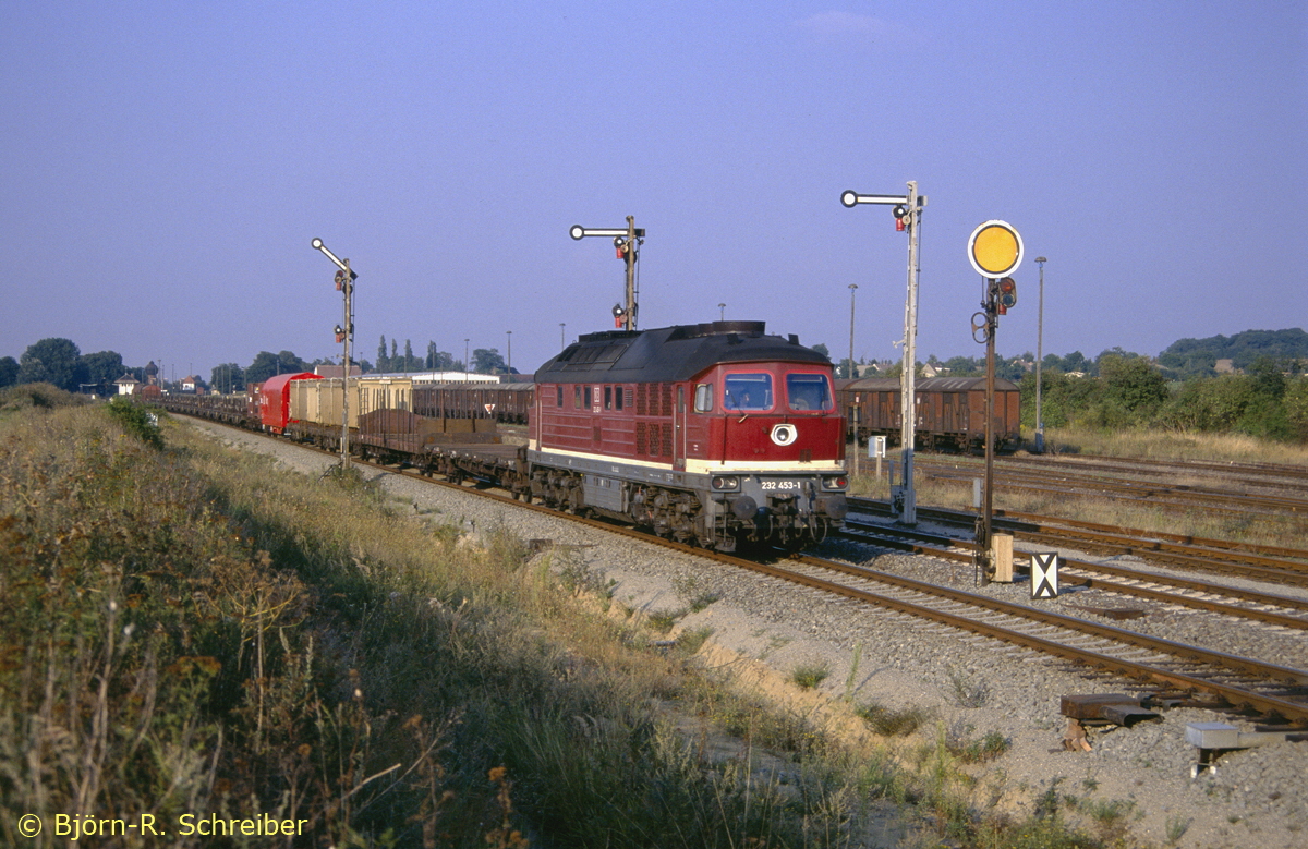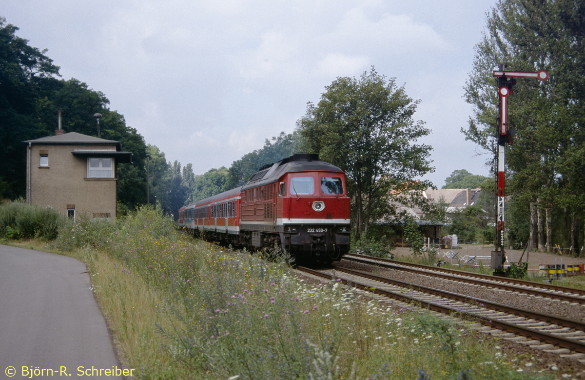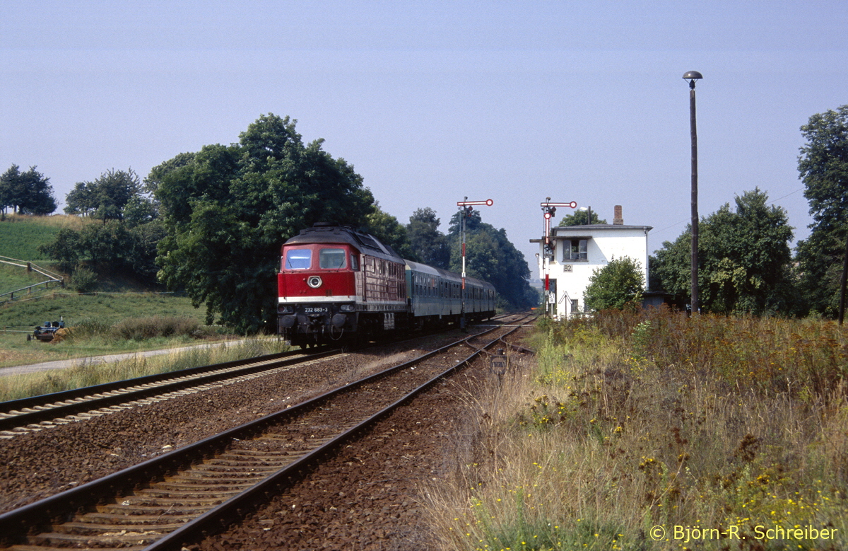 Beginnen wir am Einfahrsignal von Langenweddingen am 21.08.1997 mit 232 128 und RE 3529 |