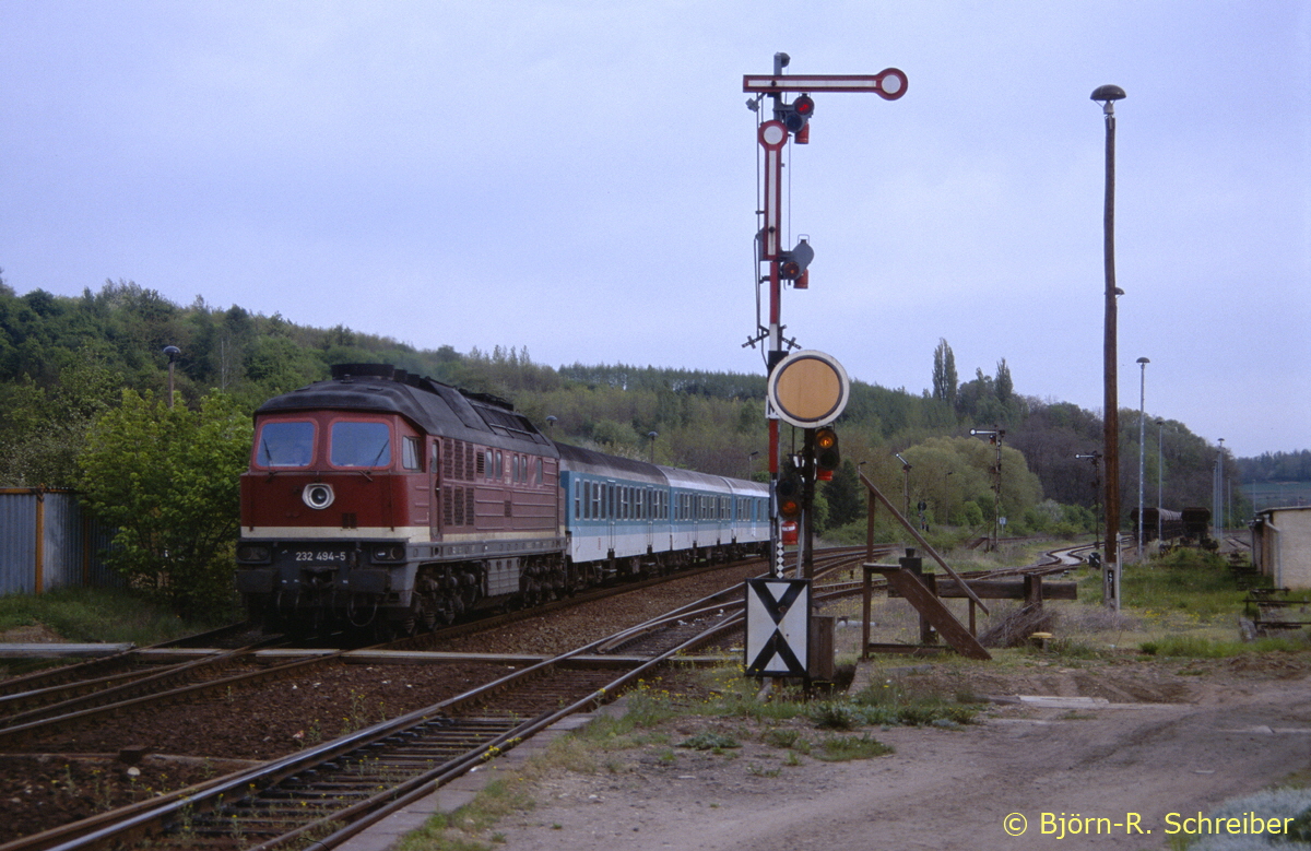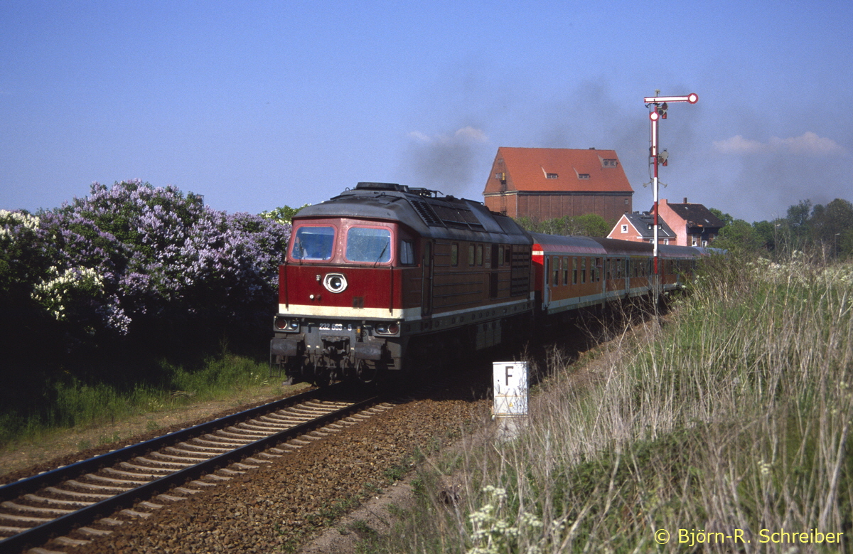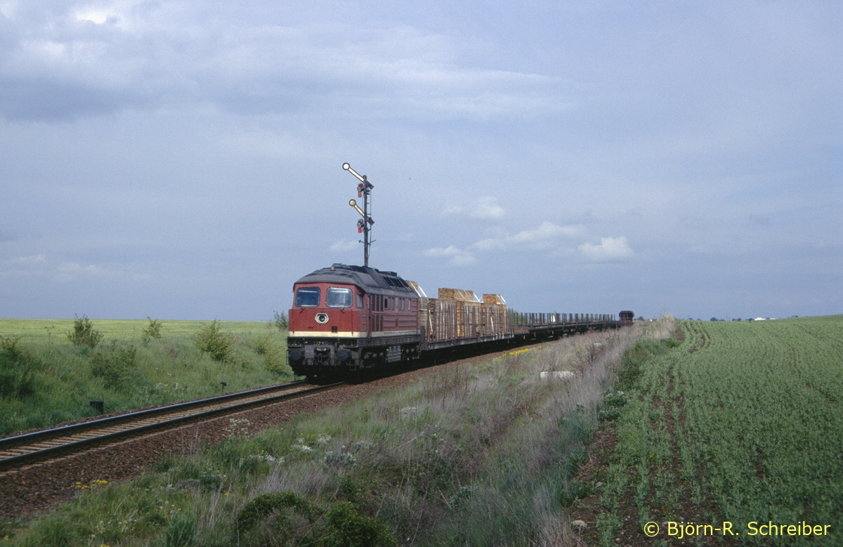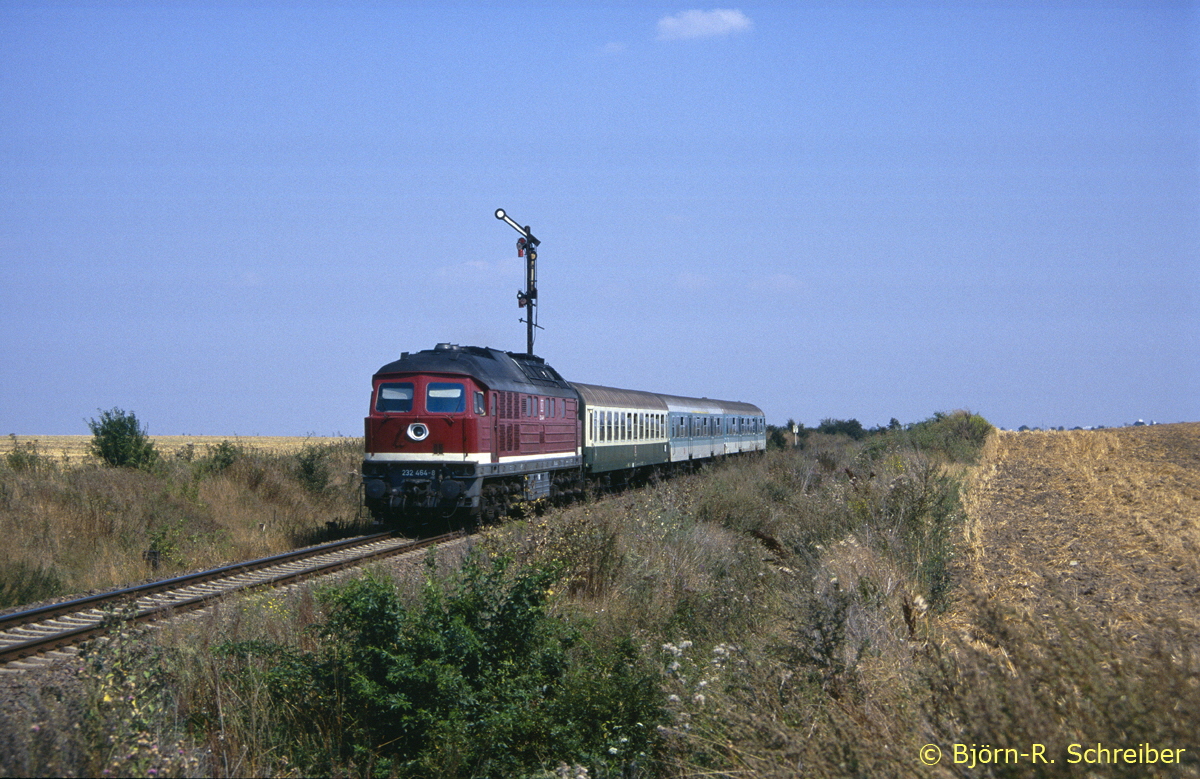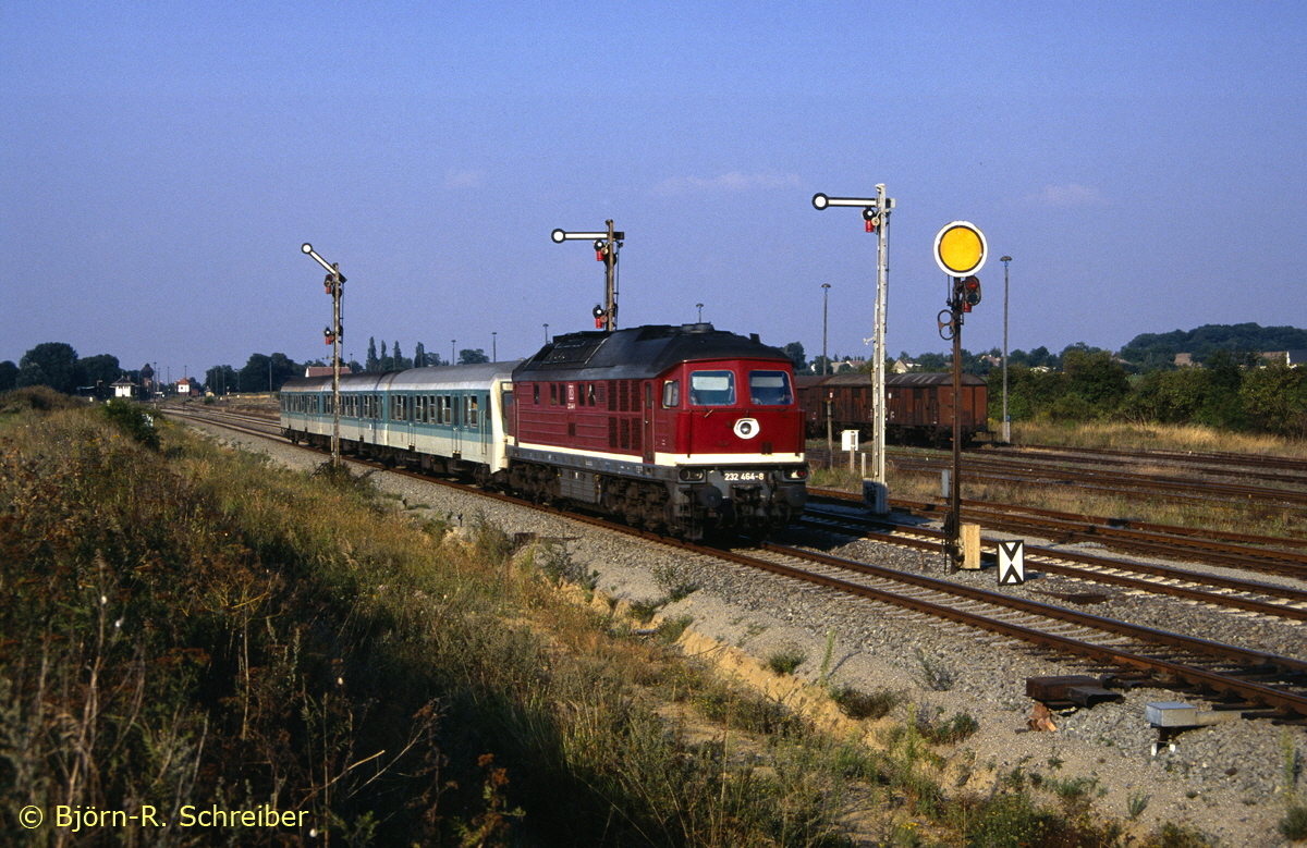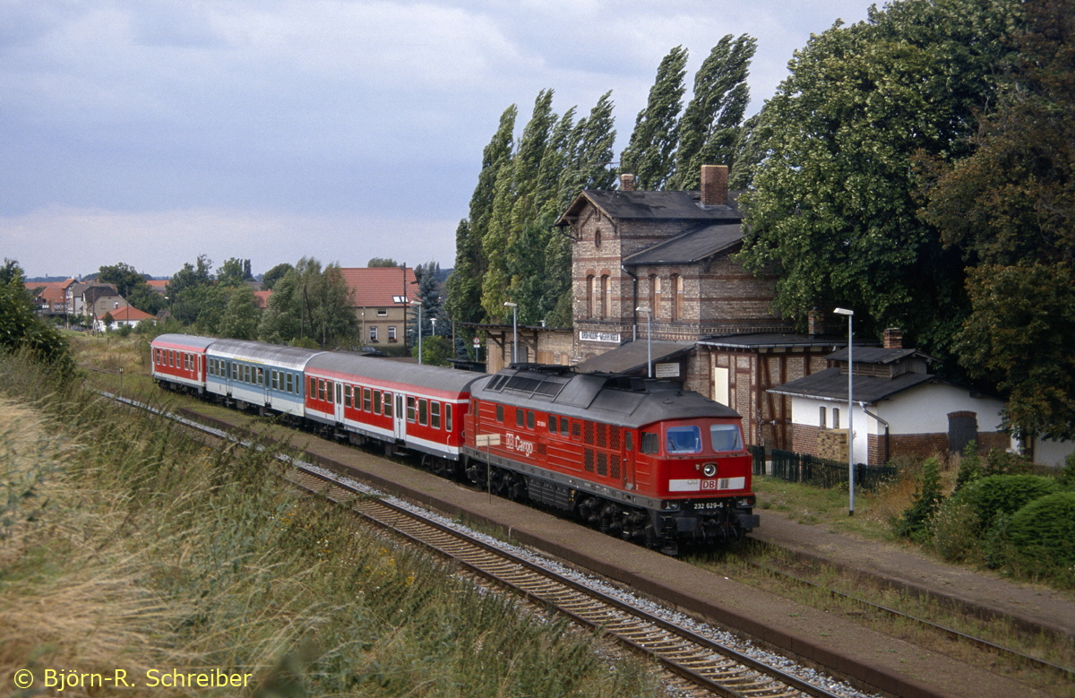 Beginnen wir am Einfahrsignal von Langenweddingen am 21.08.1997 mit 232 128 und RE 3529 |