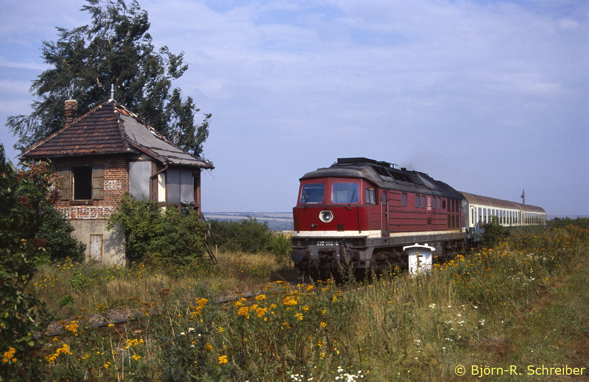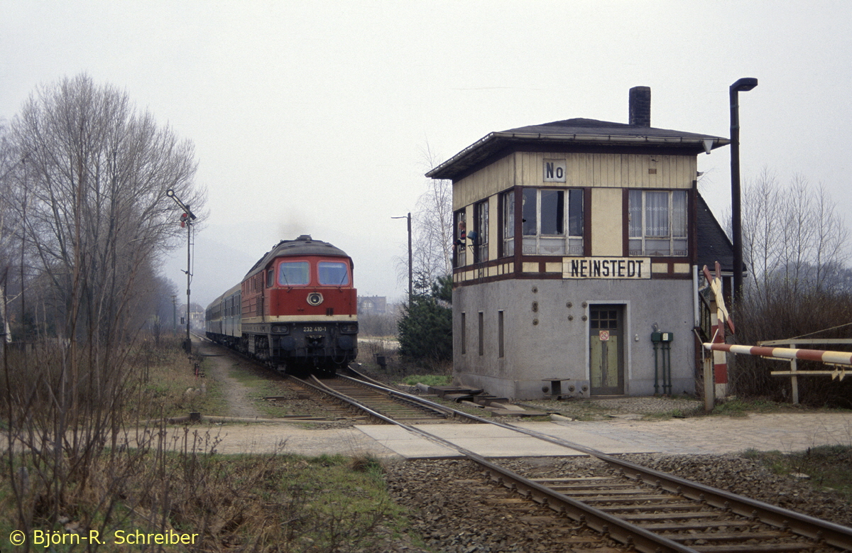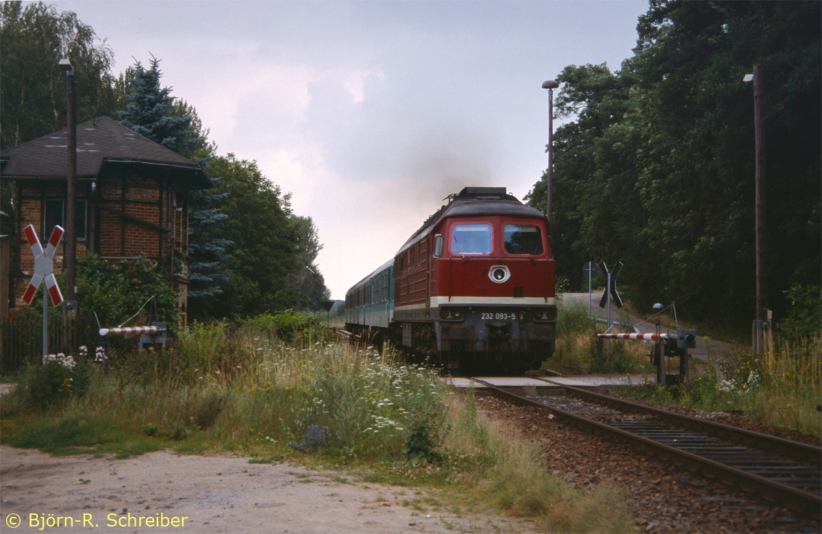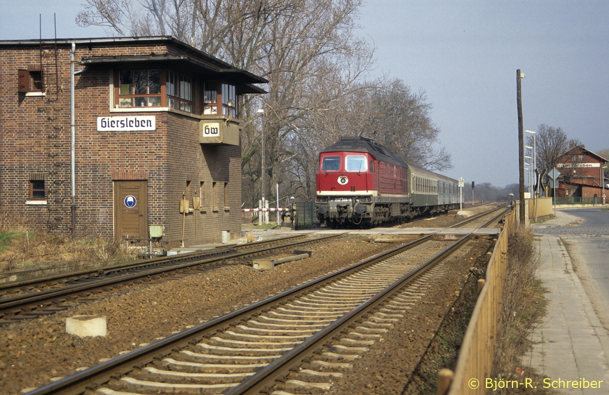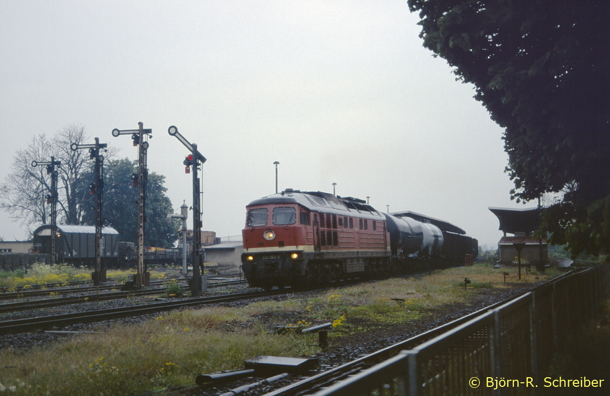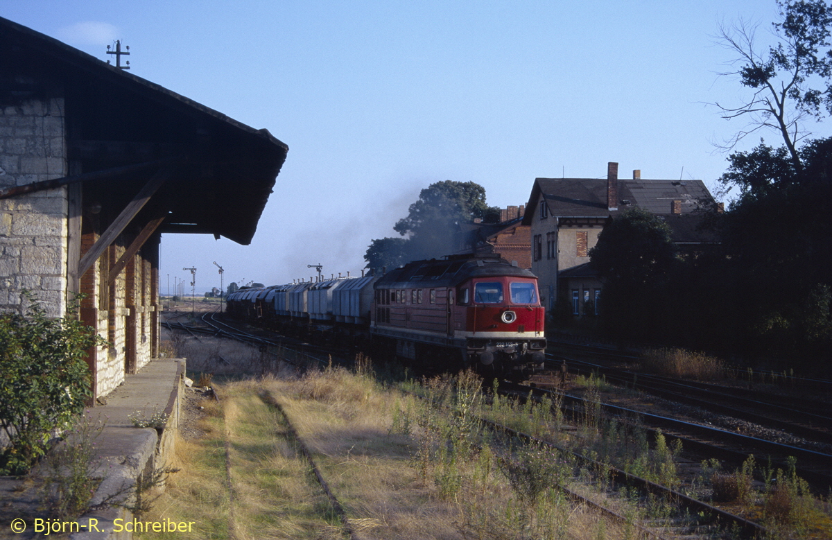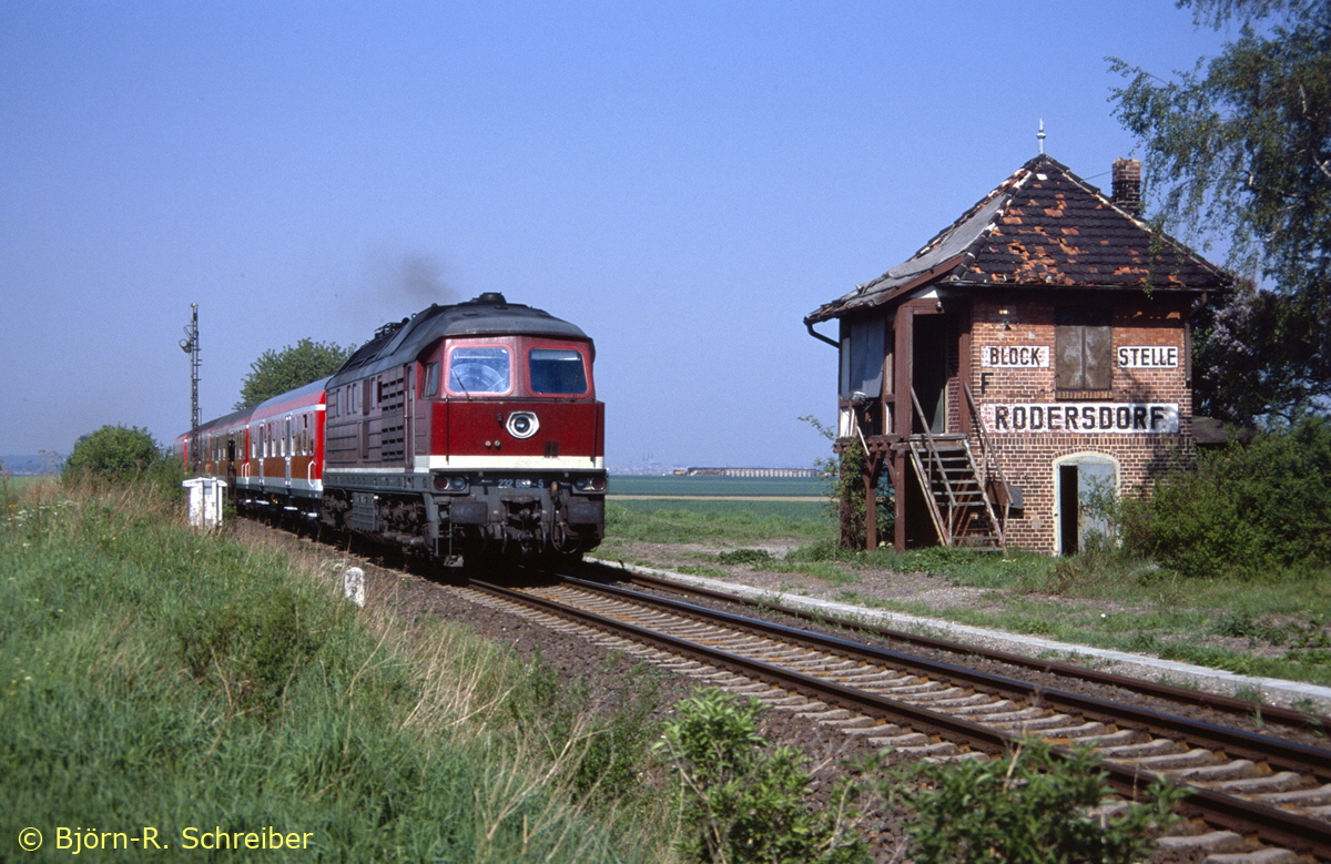 Beginnen wir am Einfahrsignal von Langenweddingen am 21.08.1997 mit 232 128 und RE 3529 |