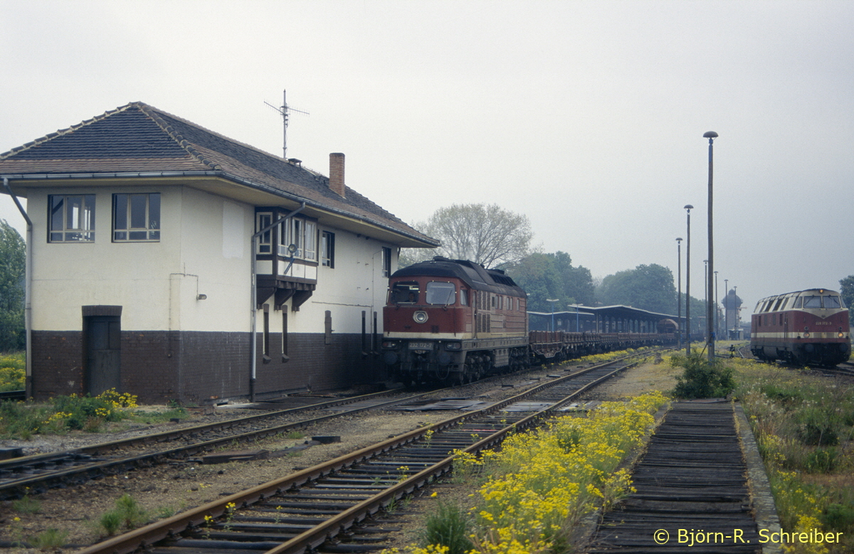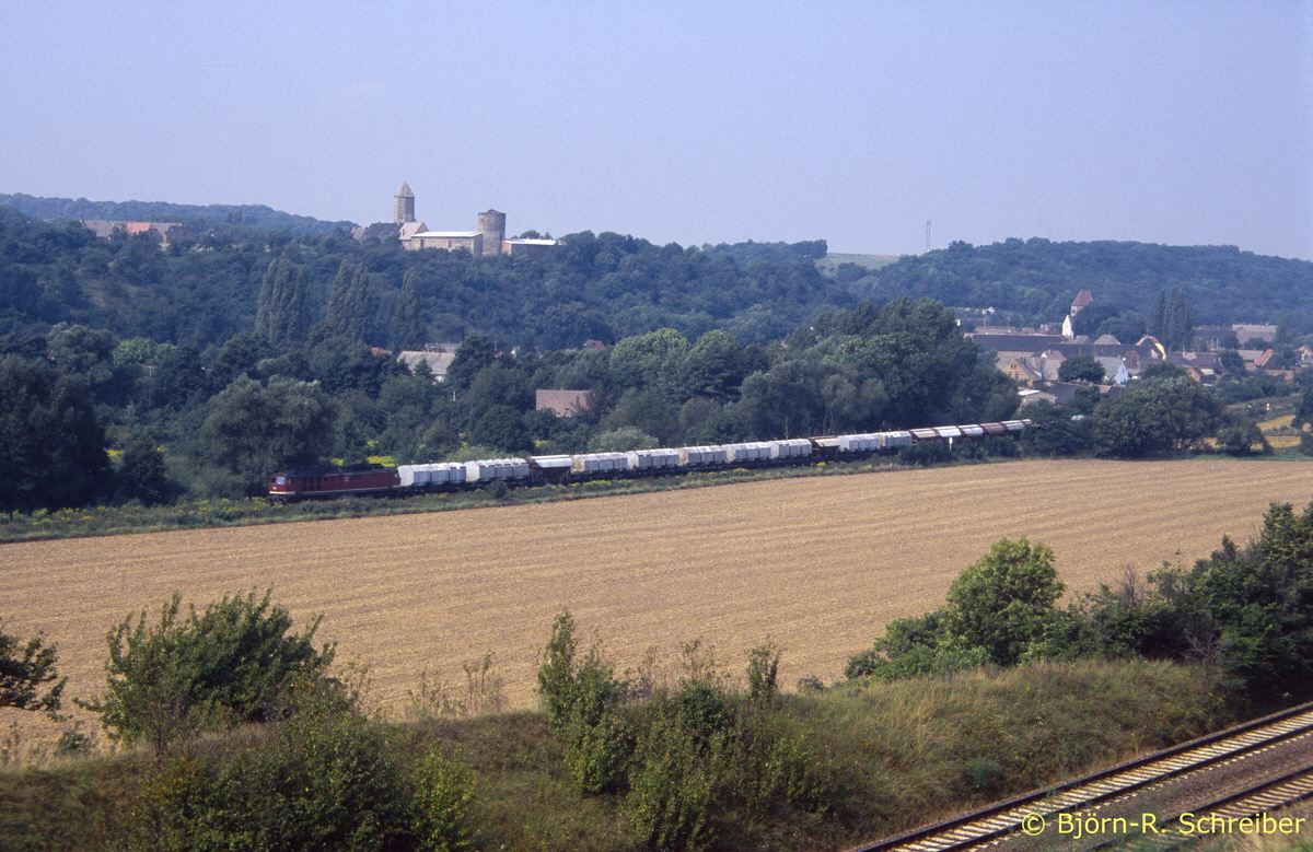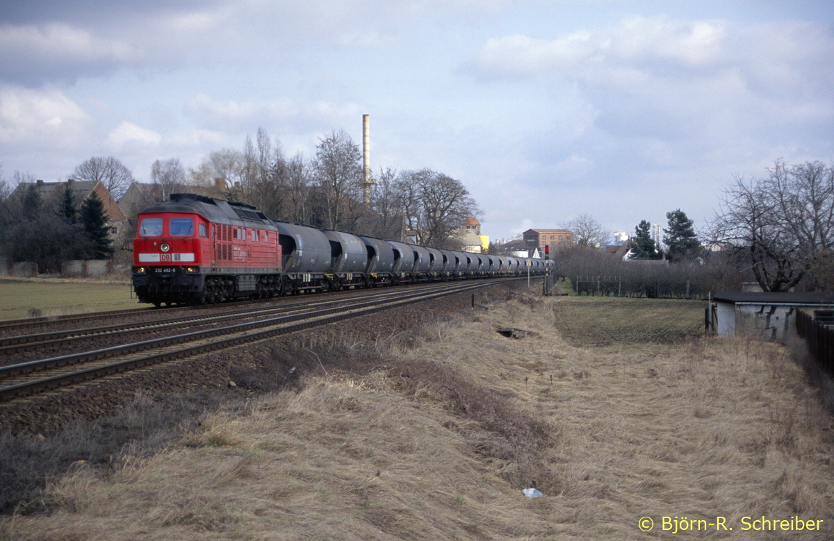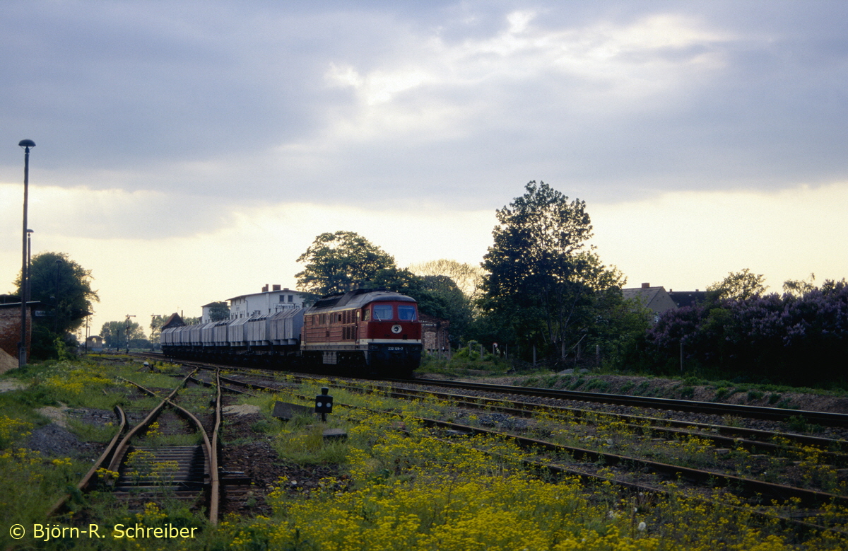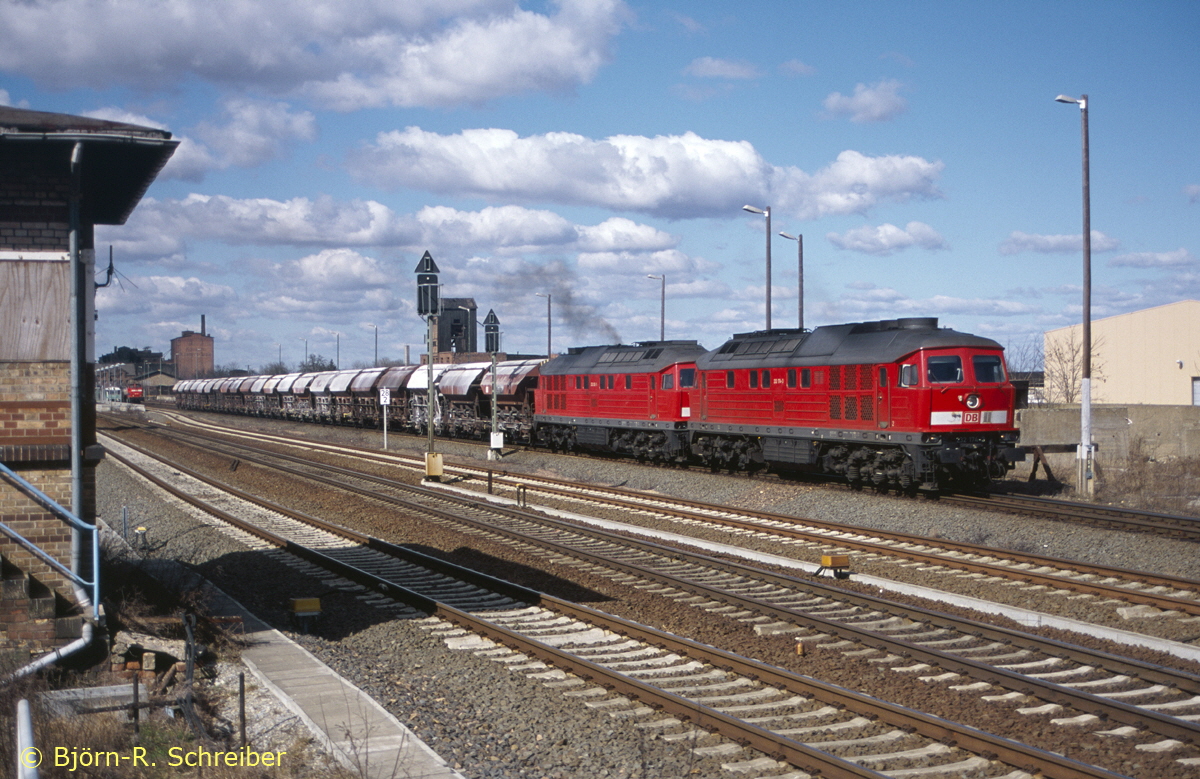 Lang her sind die Zeiten als die DB den Kalk aus Rübeland über Magdeburg nach Beddingen bringen durfte. 232 129 am 15.05.1995 mit Gag 56756 bei der Durchfahrt in Hadmersleben |