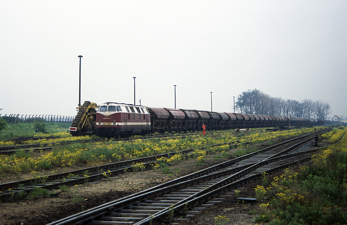 Schmuddliges Regenwetter am 17.05.1995, als 228 372 mit Üg 68568 aus Wanzleben einfährt. |