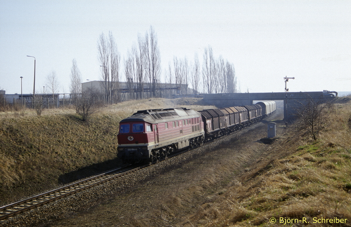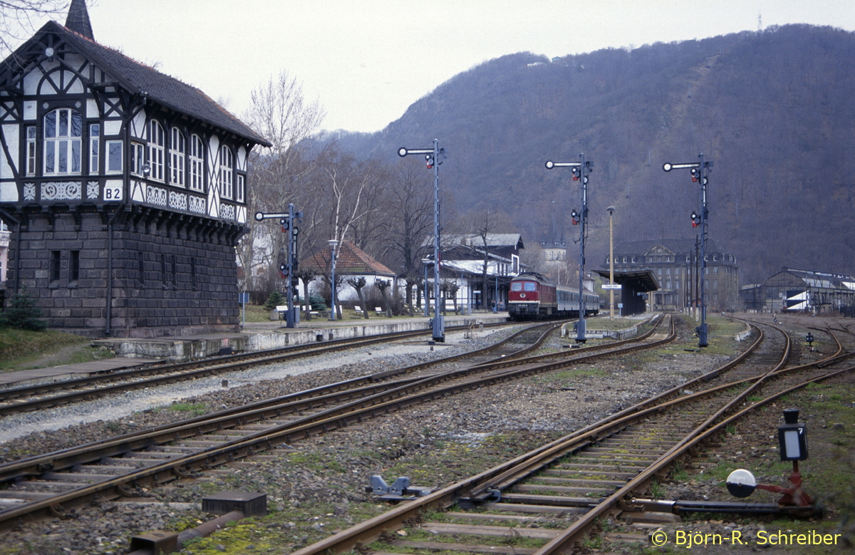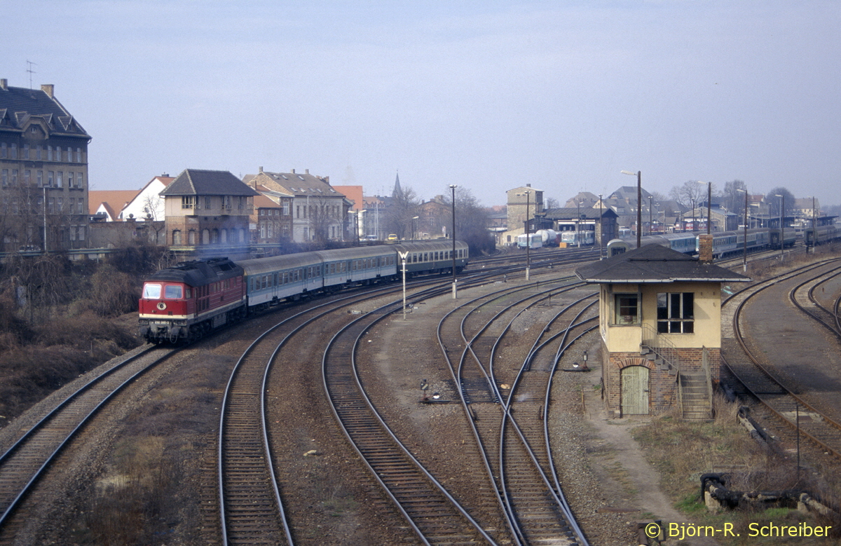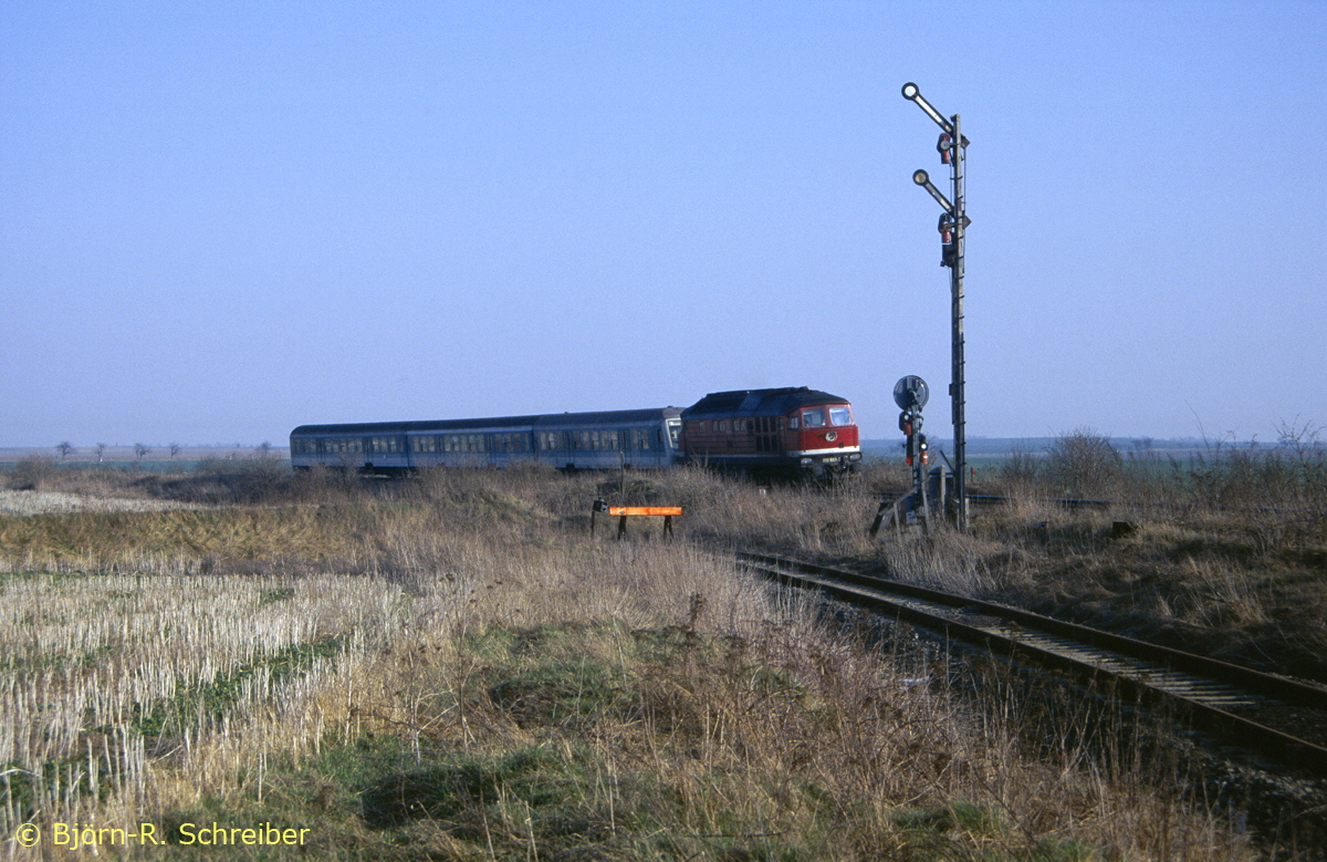 Wir machen einen Sprung und befinden uns im Abzweigbahnhof Wegeleben. 232 154 fährt am 10.03.1997 mit RE 3528 in Richtung Thale. |