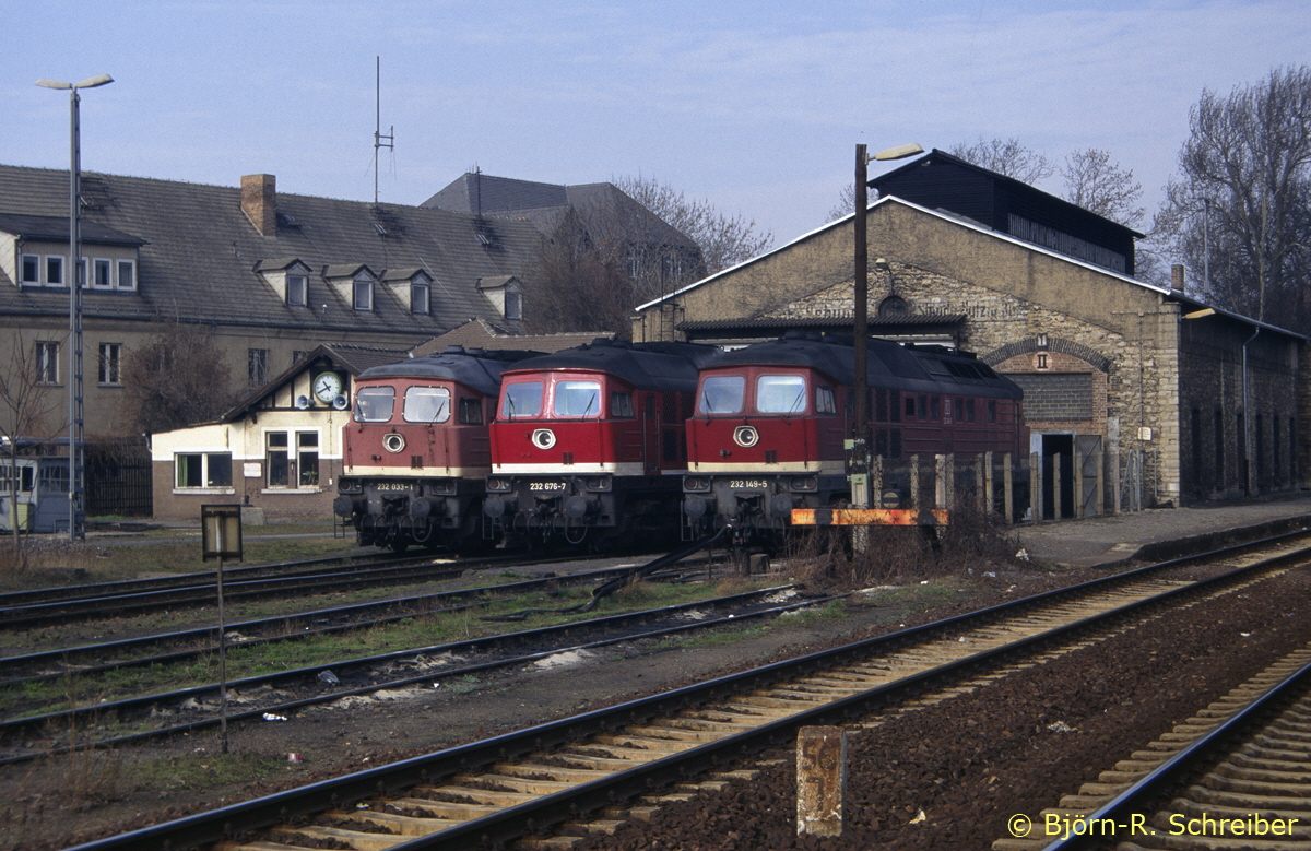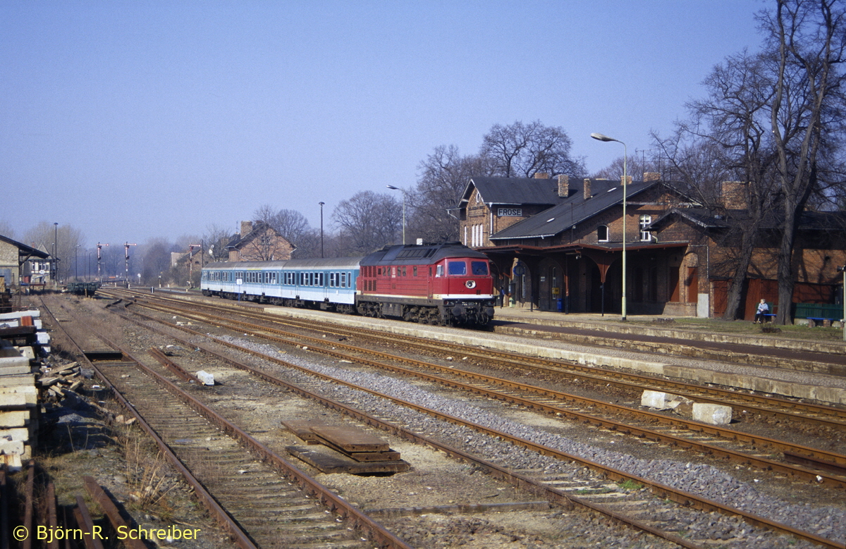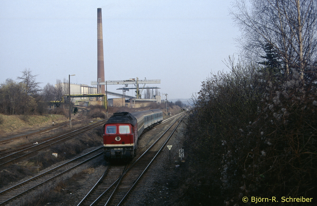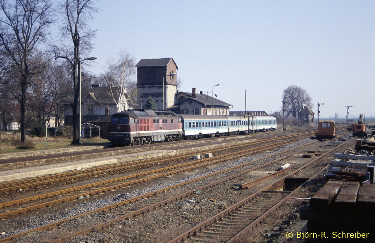 Wir machen einen Sprung und befinden uns im Abzweigbahnhof Wegeleben. 232 154 fährt am 10.03.1997 mit RE 3528 in Richtung Thale. |