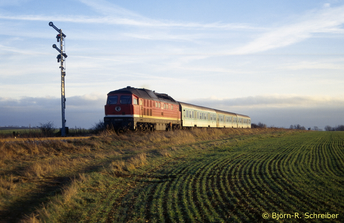 3 Jahre vorher trug 232 566 noch einen ganz anderen Farbton: RE 3529 am 18.12.1996 bei Wegeleben |